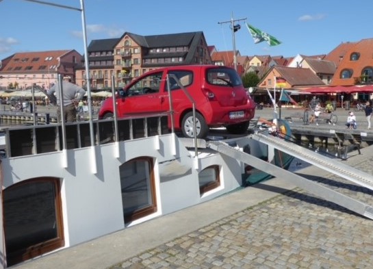 This 21.50-metre barge also stands out for its ingenious system of turntable, ramps and winch, allowing a small car such as a Twingo (900 kg) to be loaded or unloaded from a quay, manually and quickly, by just one or two people.