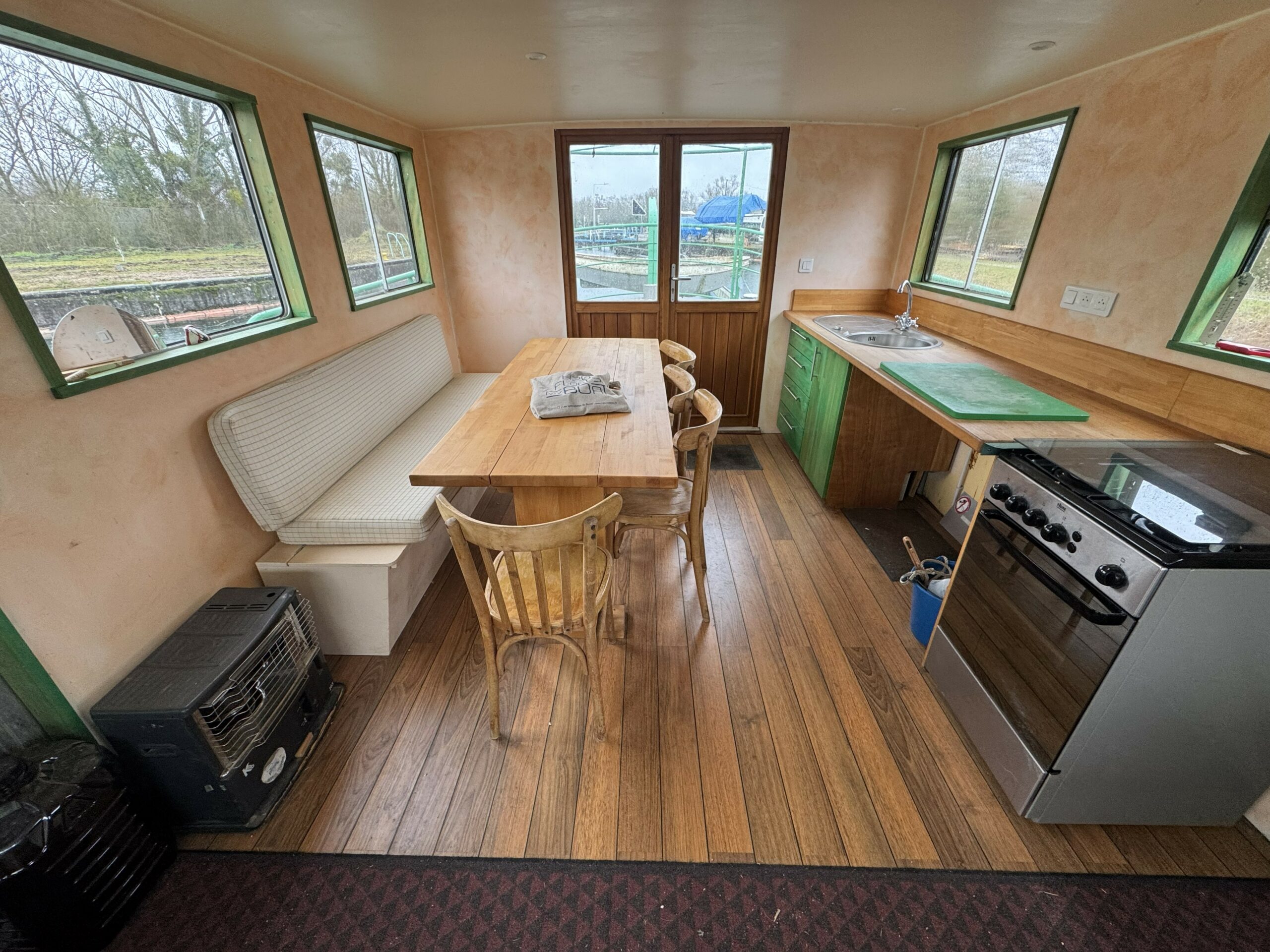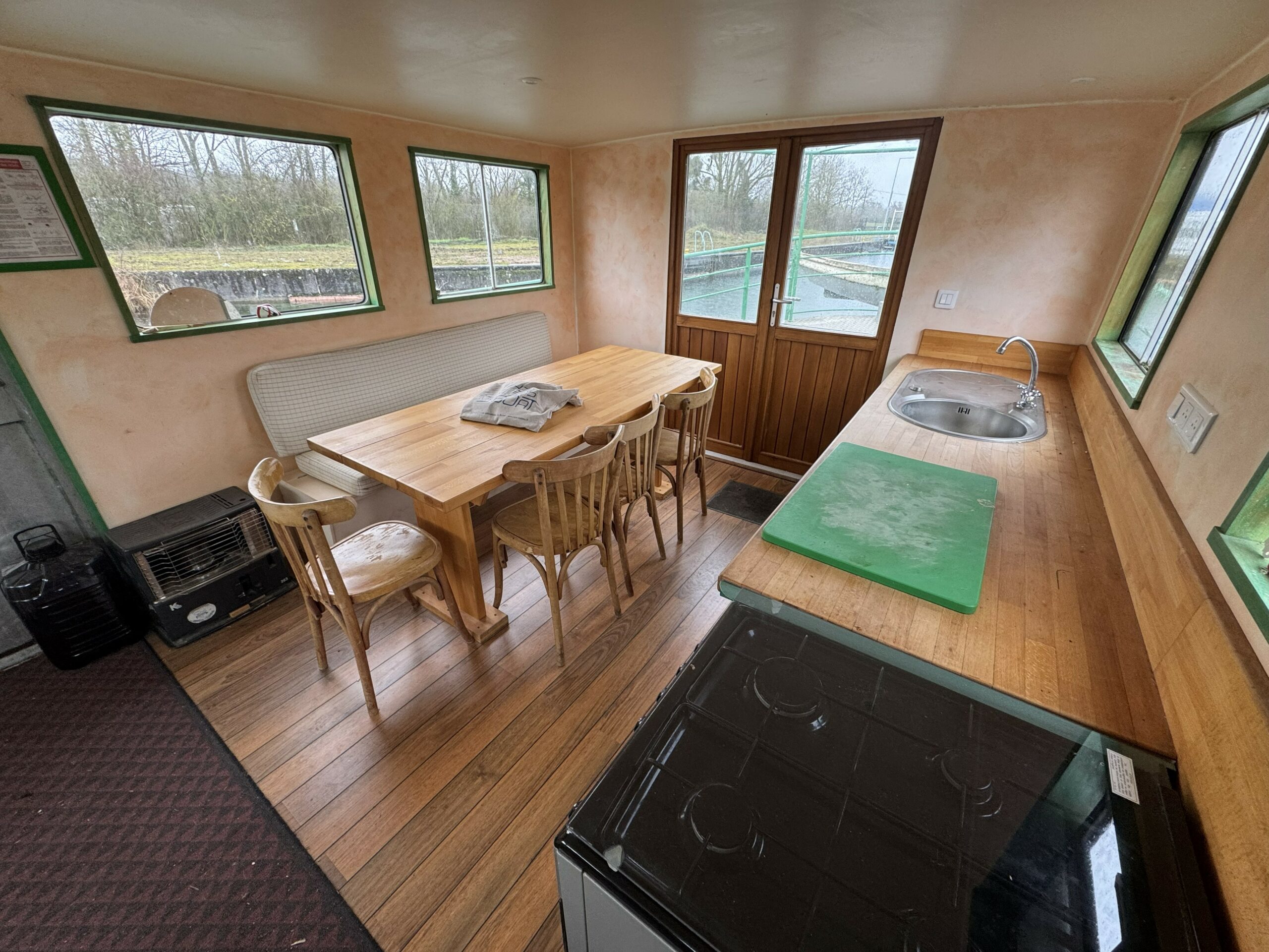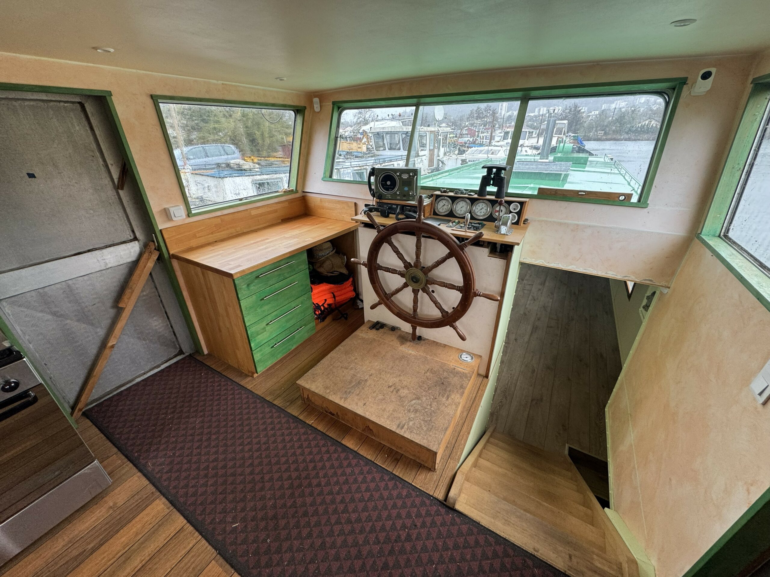 The single-level aft deck provides direct access to the wheelhouse, now converted into a large kitchen bathed in natural light, exuding a warm and friendly atmosphere.