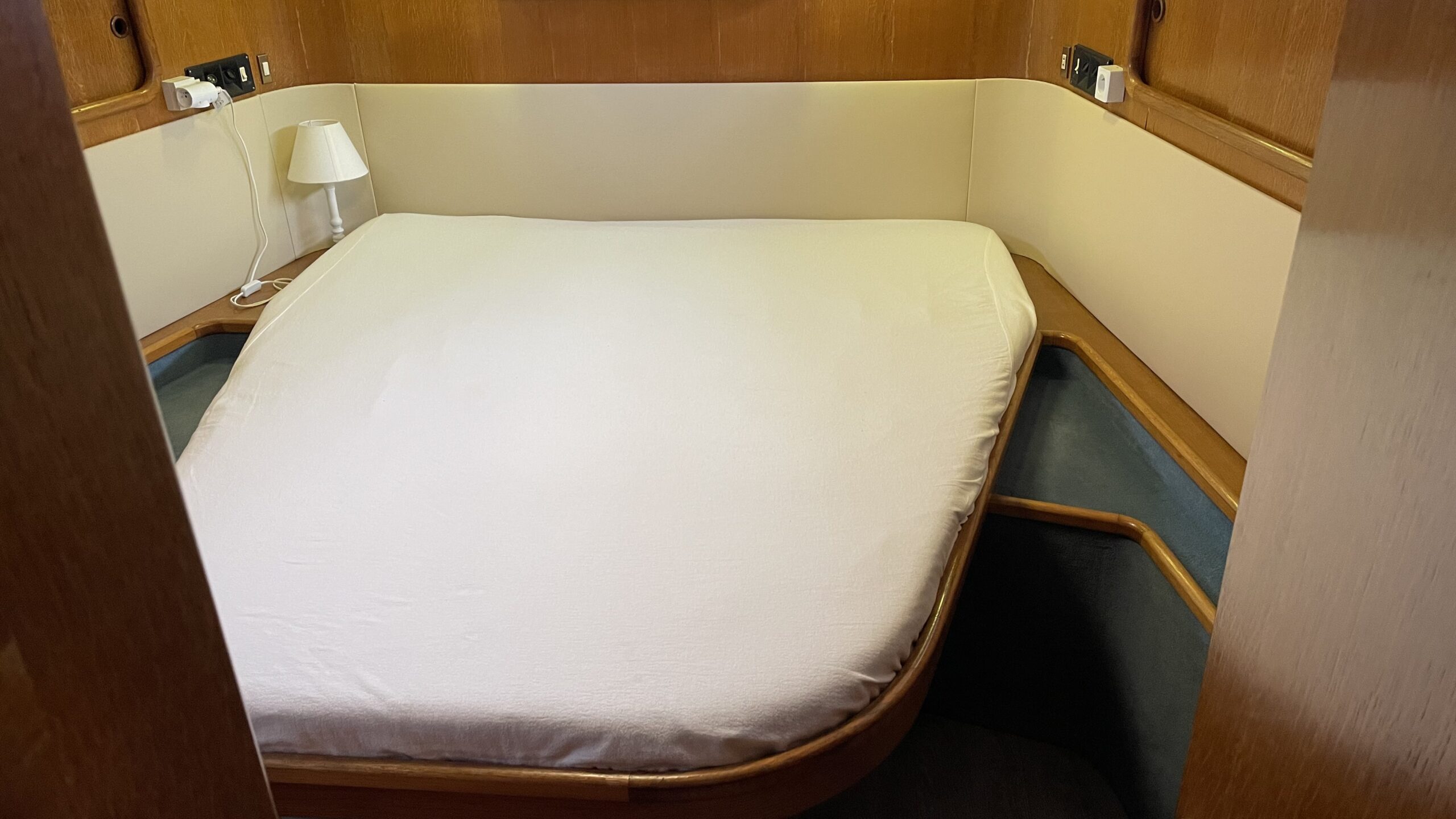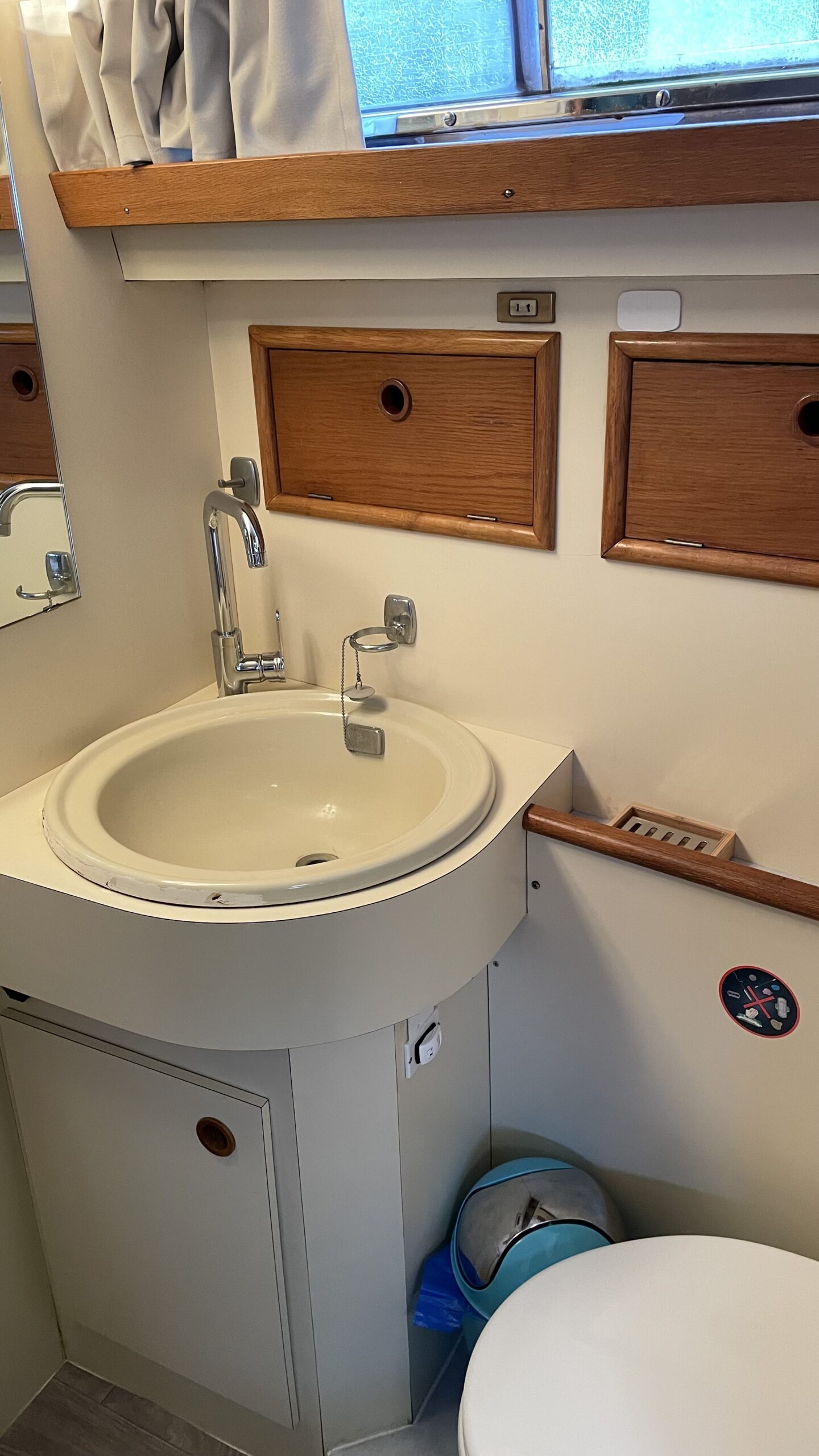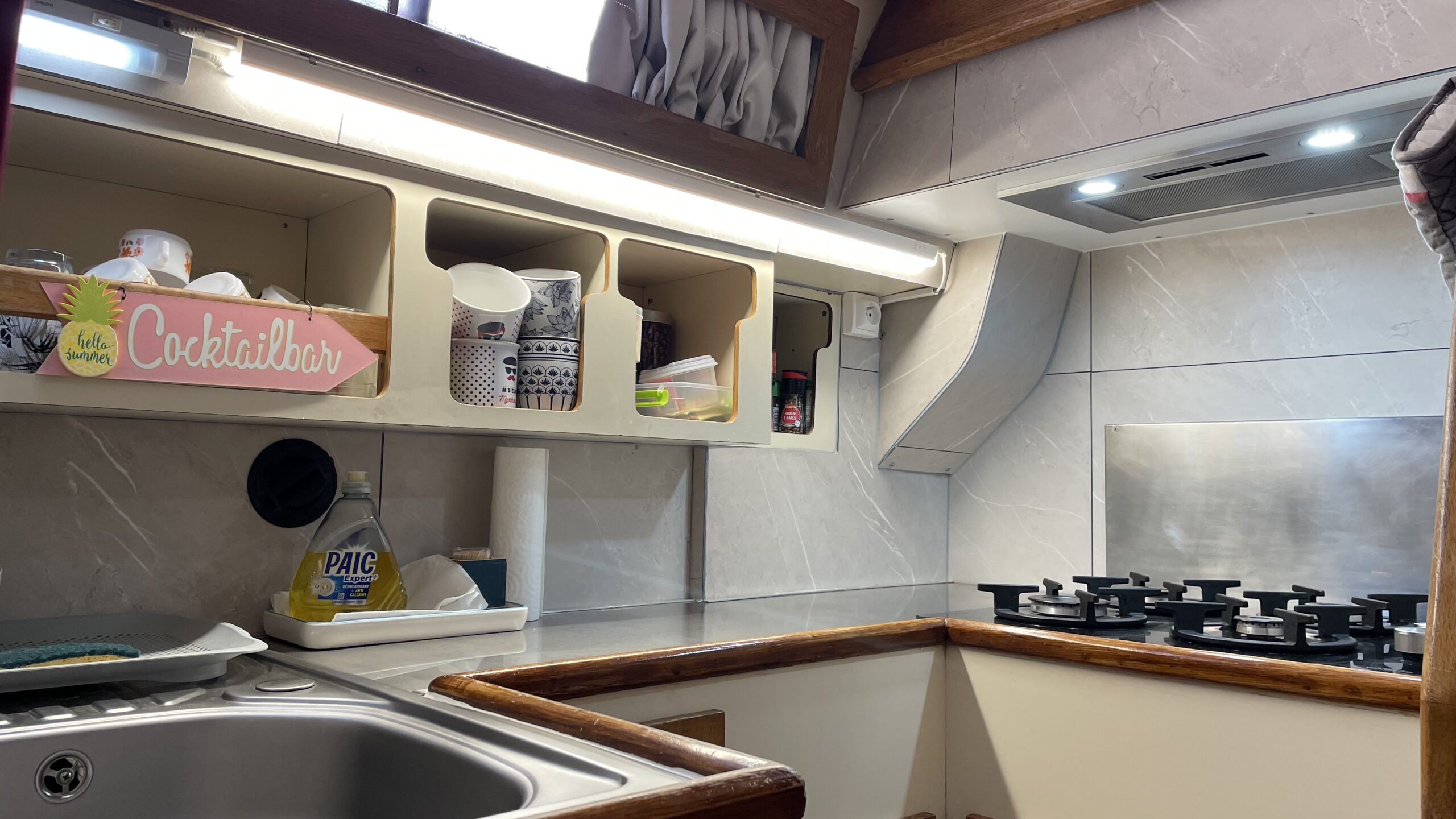 The interior offers a spacious and bright living area, ideal for fully enjoying life on board. Indeed, it features two comfortable cabins, a bathroom, a fully equipped kitchen with a gas hob, 200V refrigerator, freezer, and microwave, as well as a sociable saloon, perfect for sharing meals or relaxing moments.