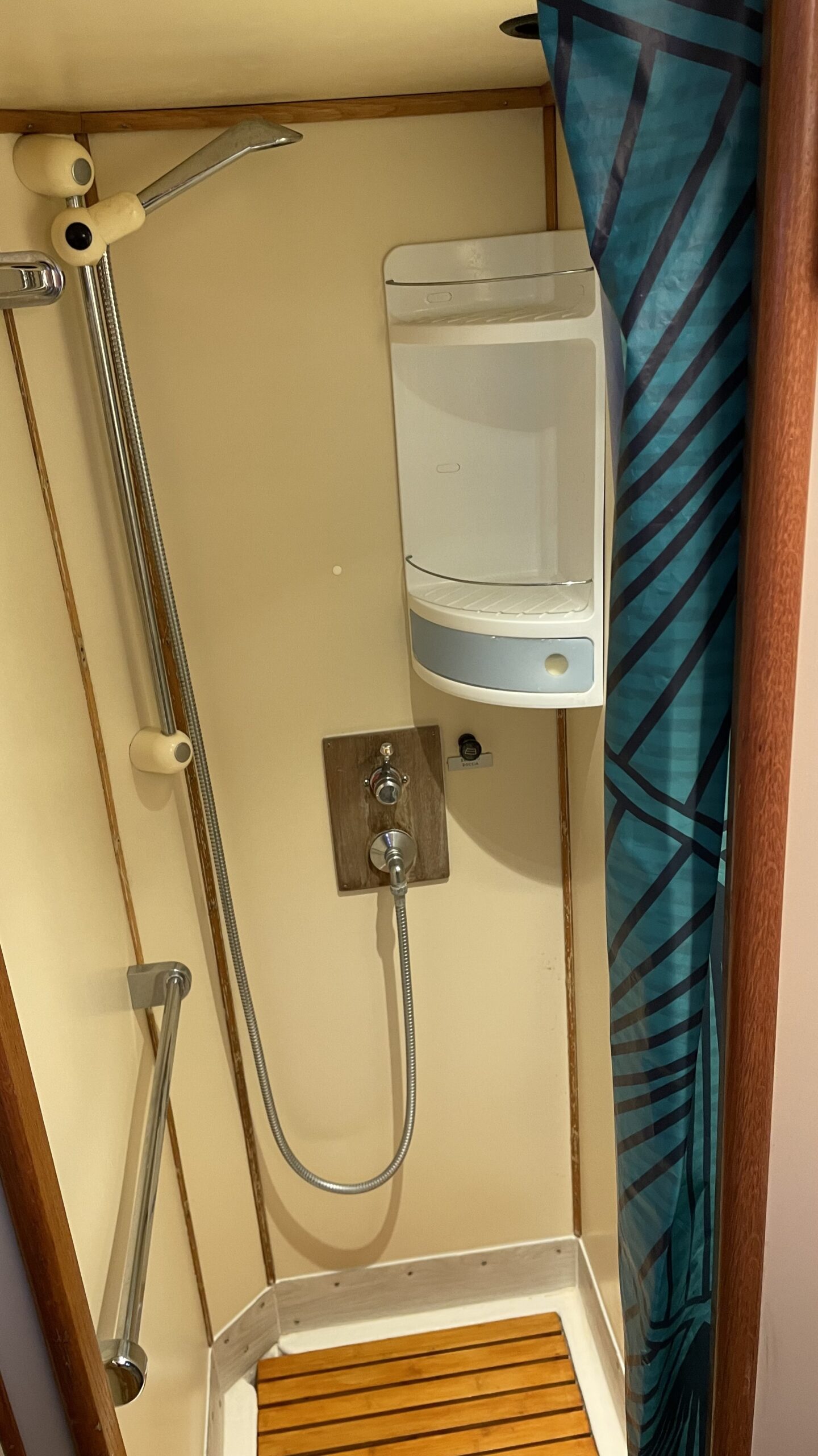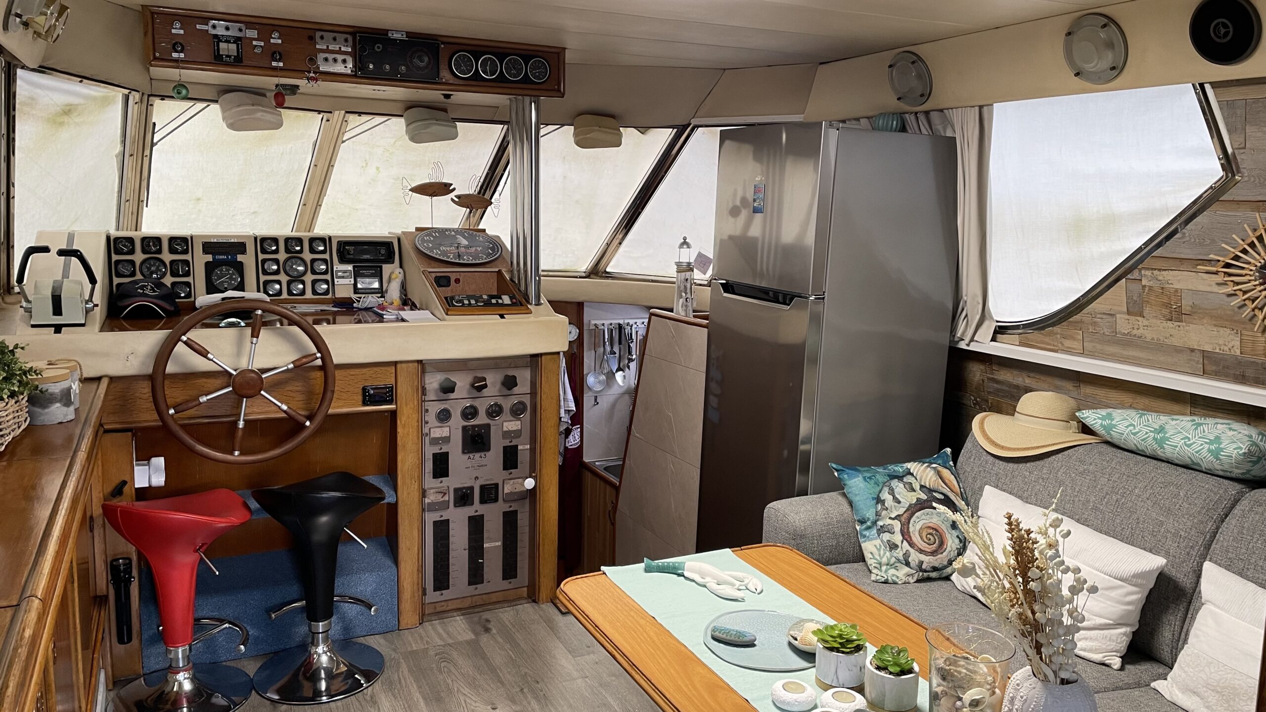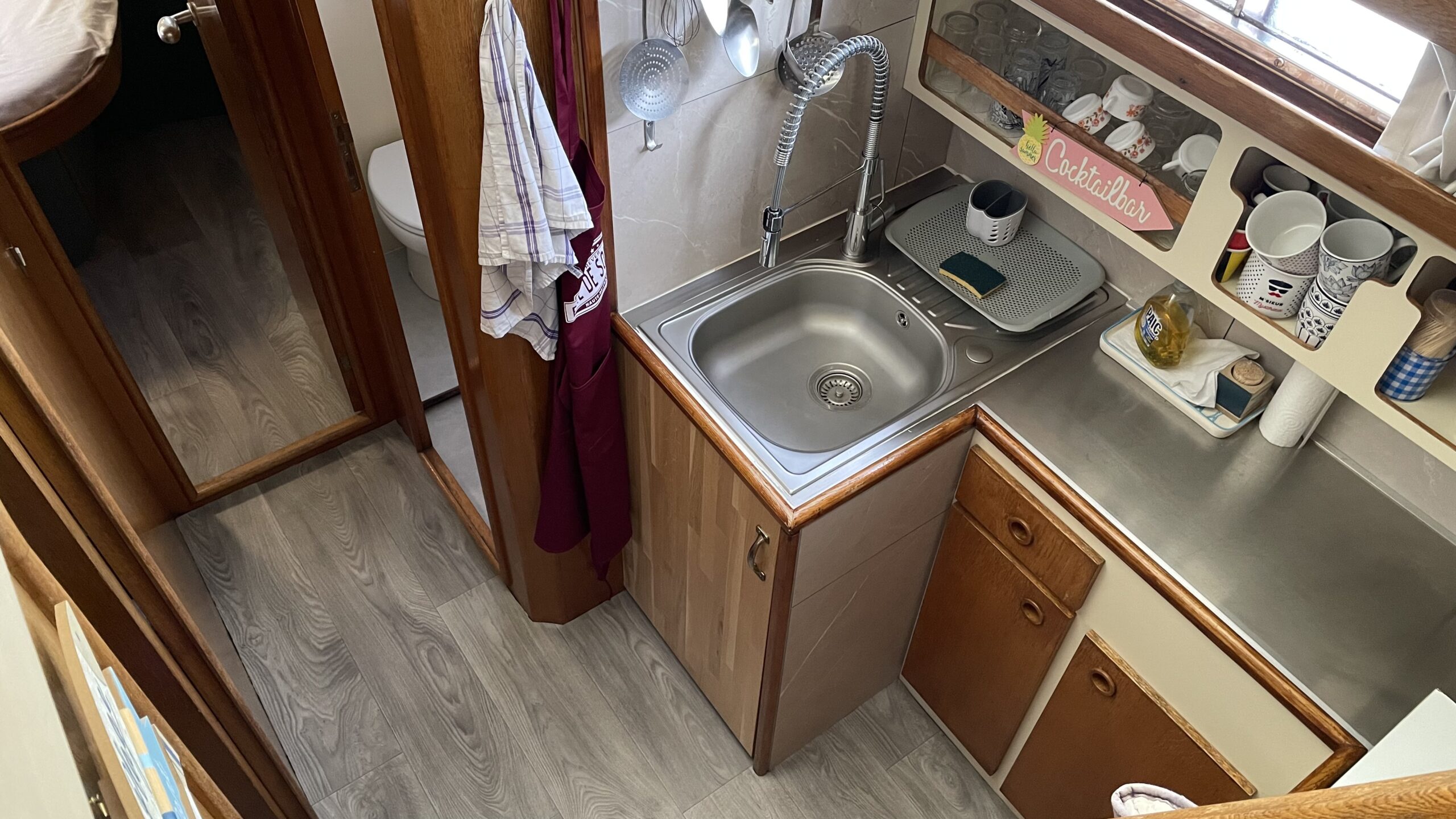The interior offers a spacious and bright living area, ideal for fully enjoying life on board. Indeed, it features two comfortable cabins, a bathroom, a fully equipped kitchen with a gas hob, 200V refrigerator, freezer, and microwave, as well as a sociable saloon, perfect for sharing meals or relaxing moments.