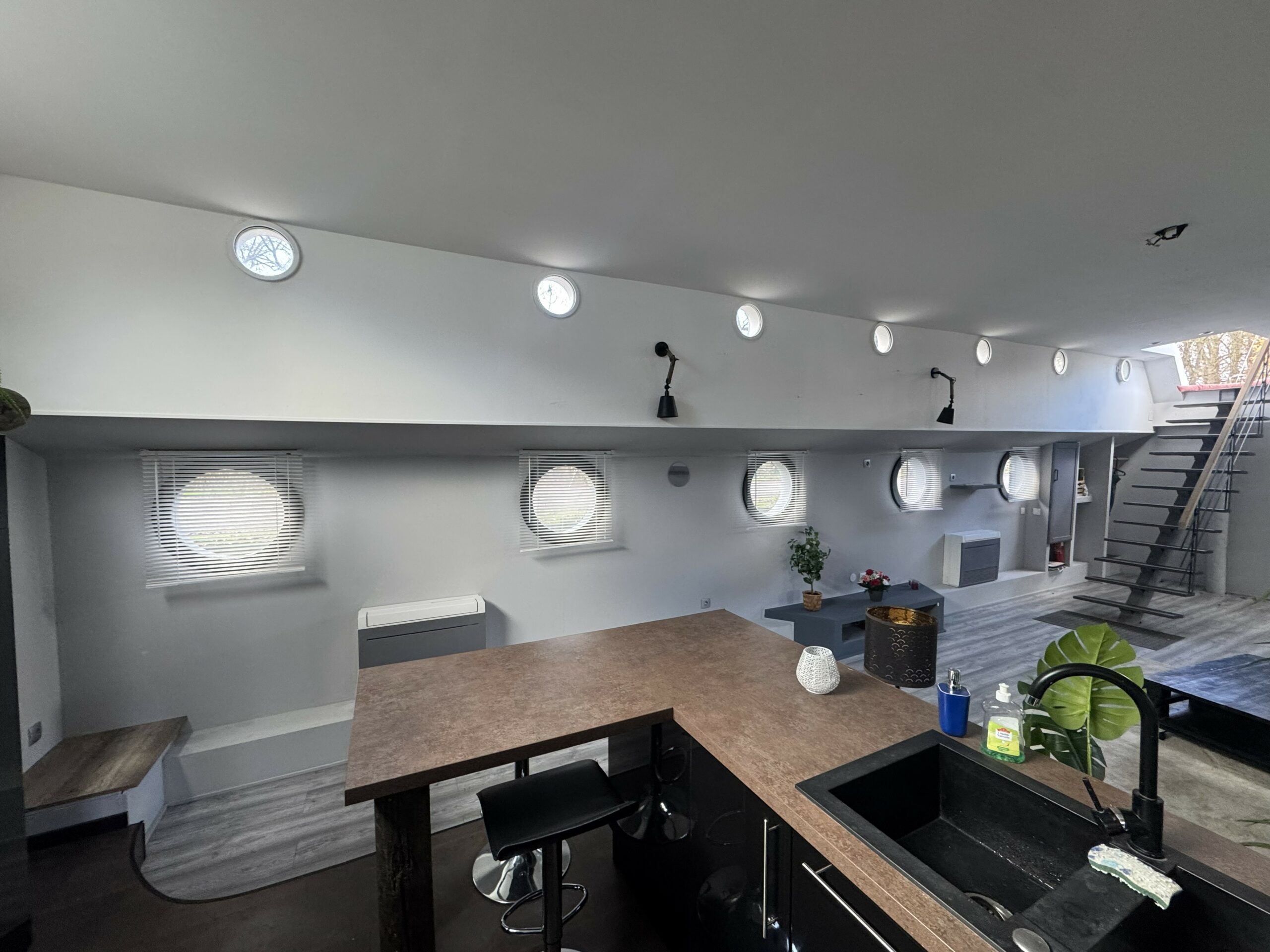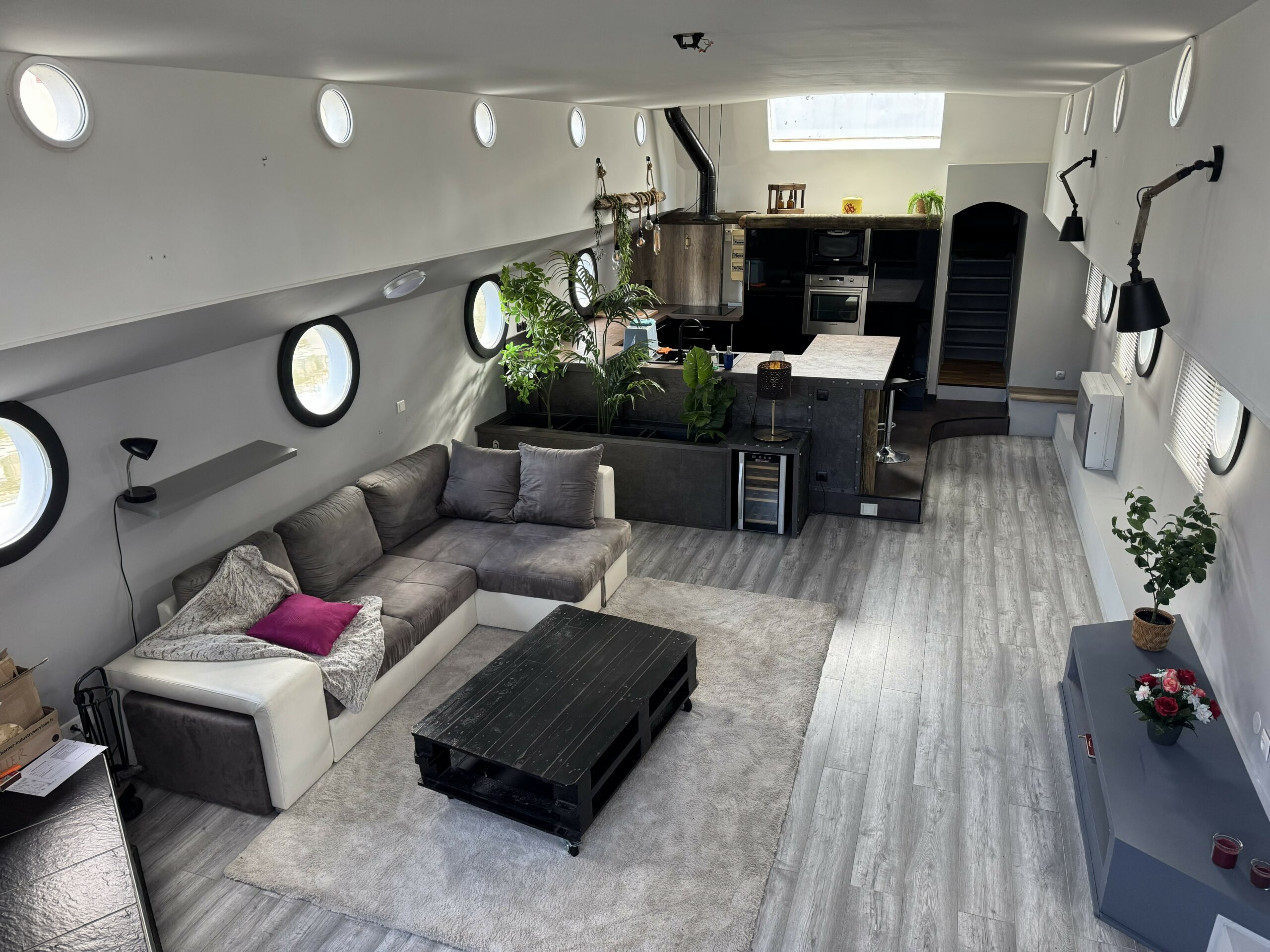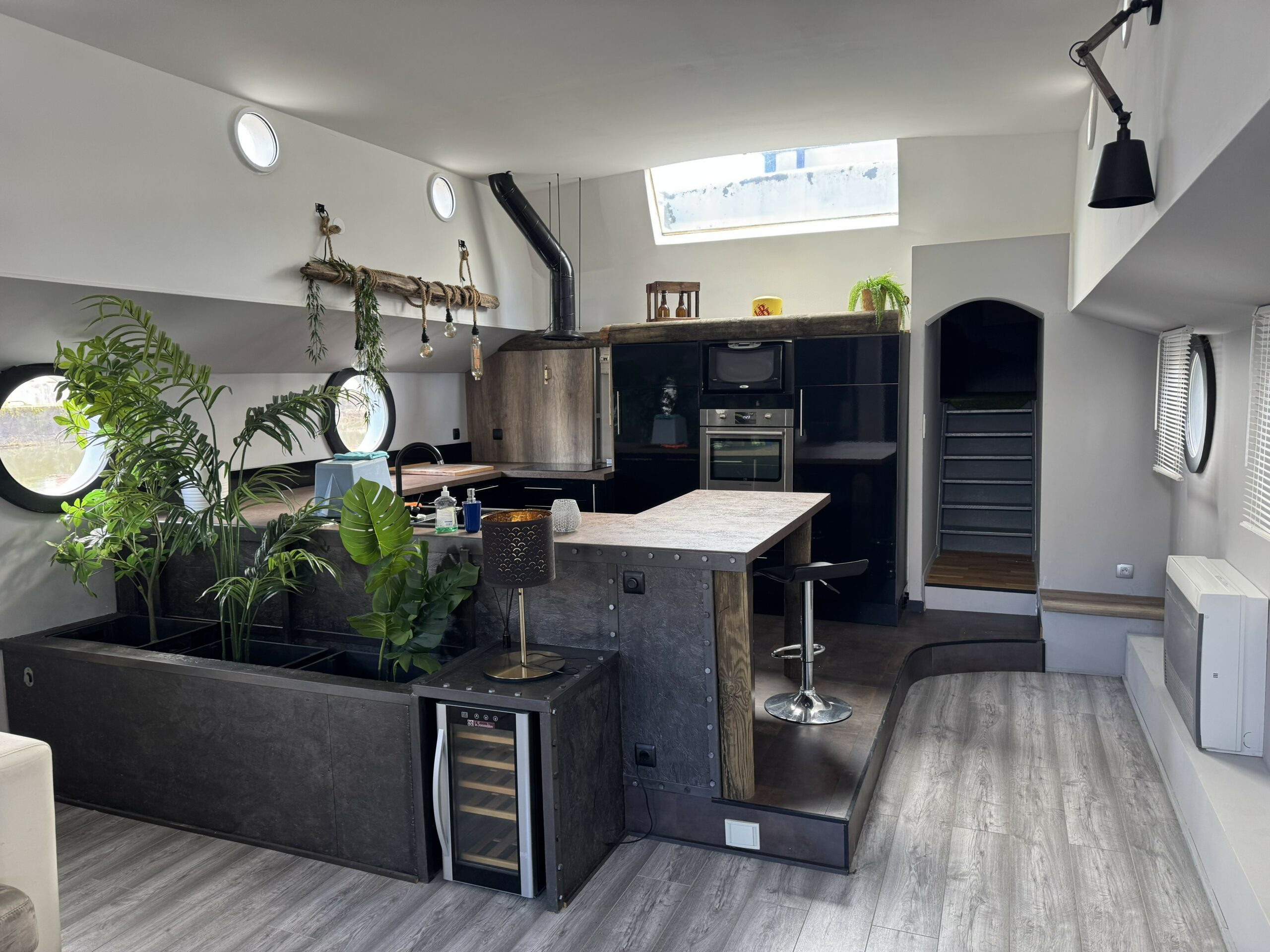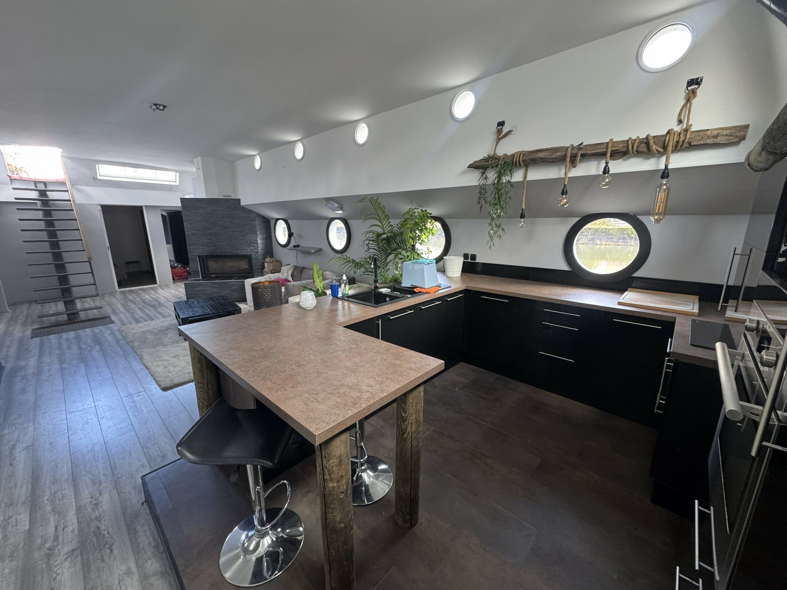 The heart of the boat is a huge, light-filled living room with high ceilings, opening onto a contemporary kitchen, ideal for entertaining and sharing. A fireplace, complemented by a heat pump, ensures optimal comfort throughout the year.