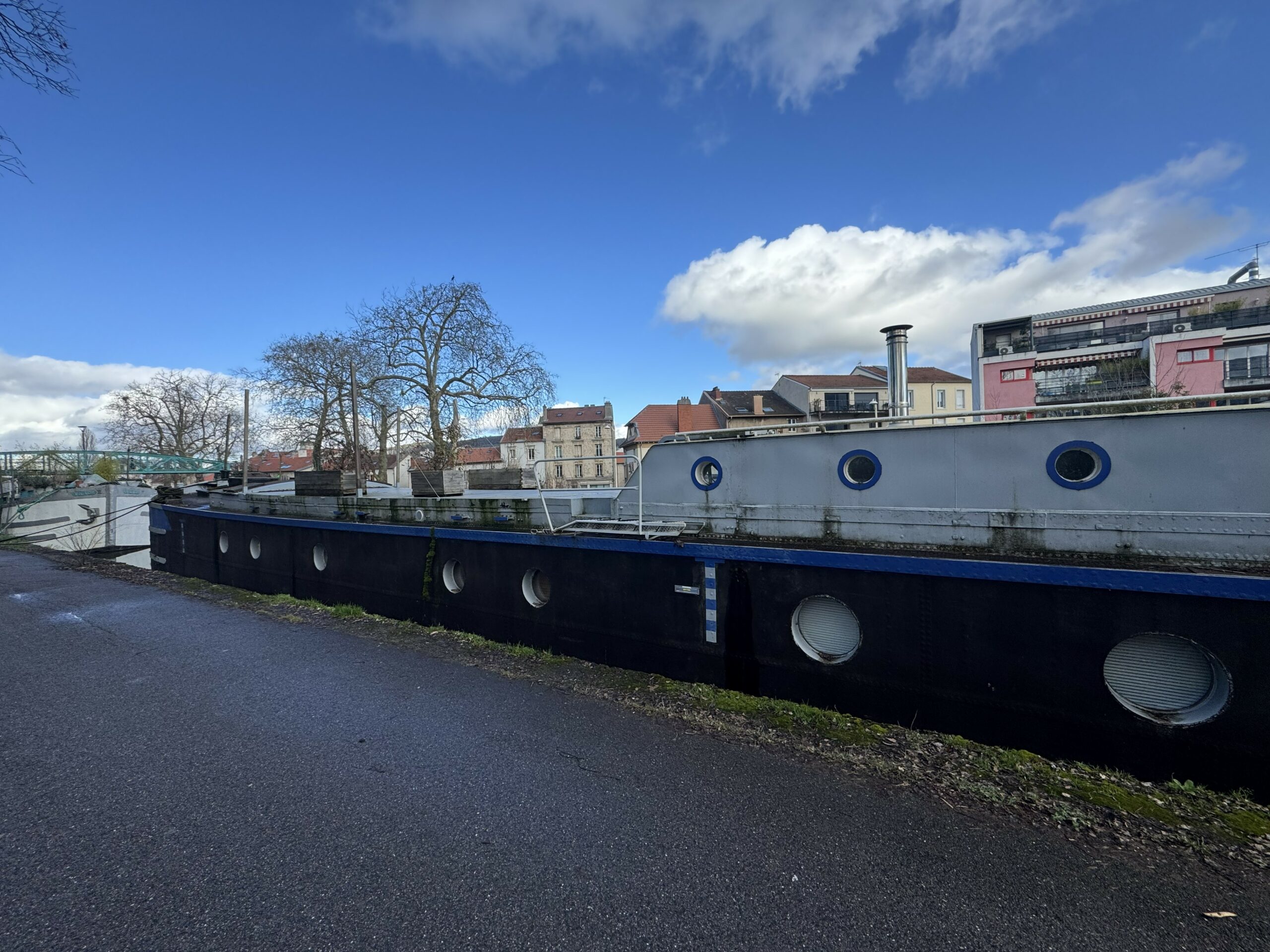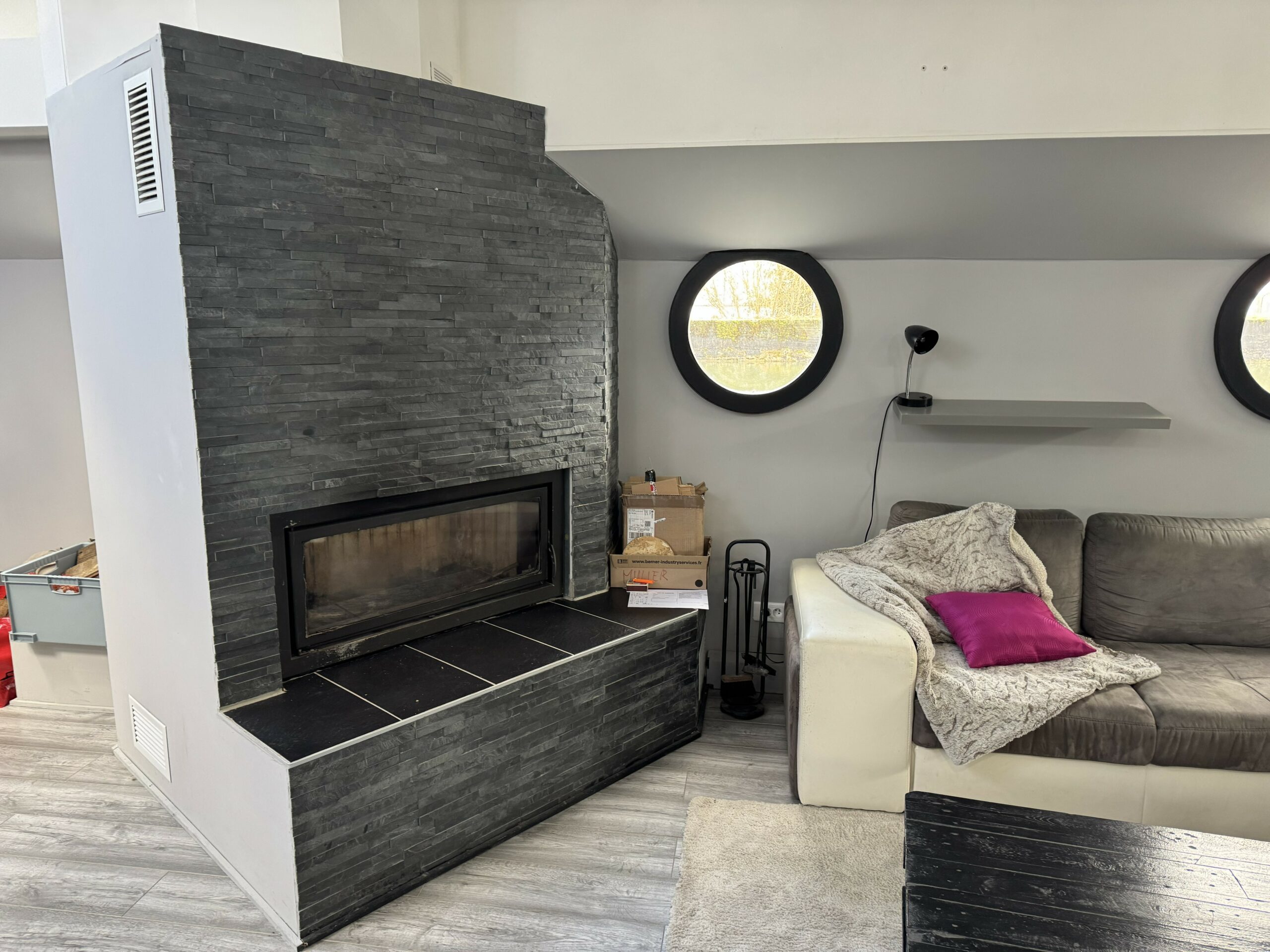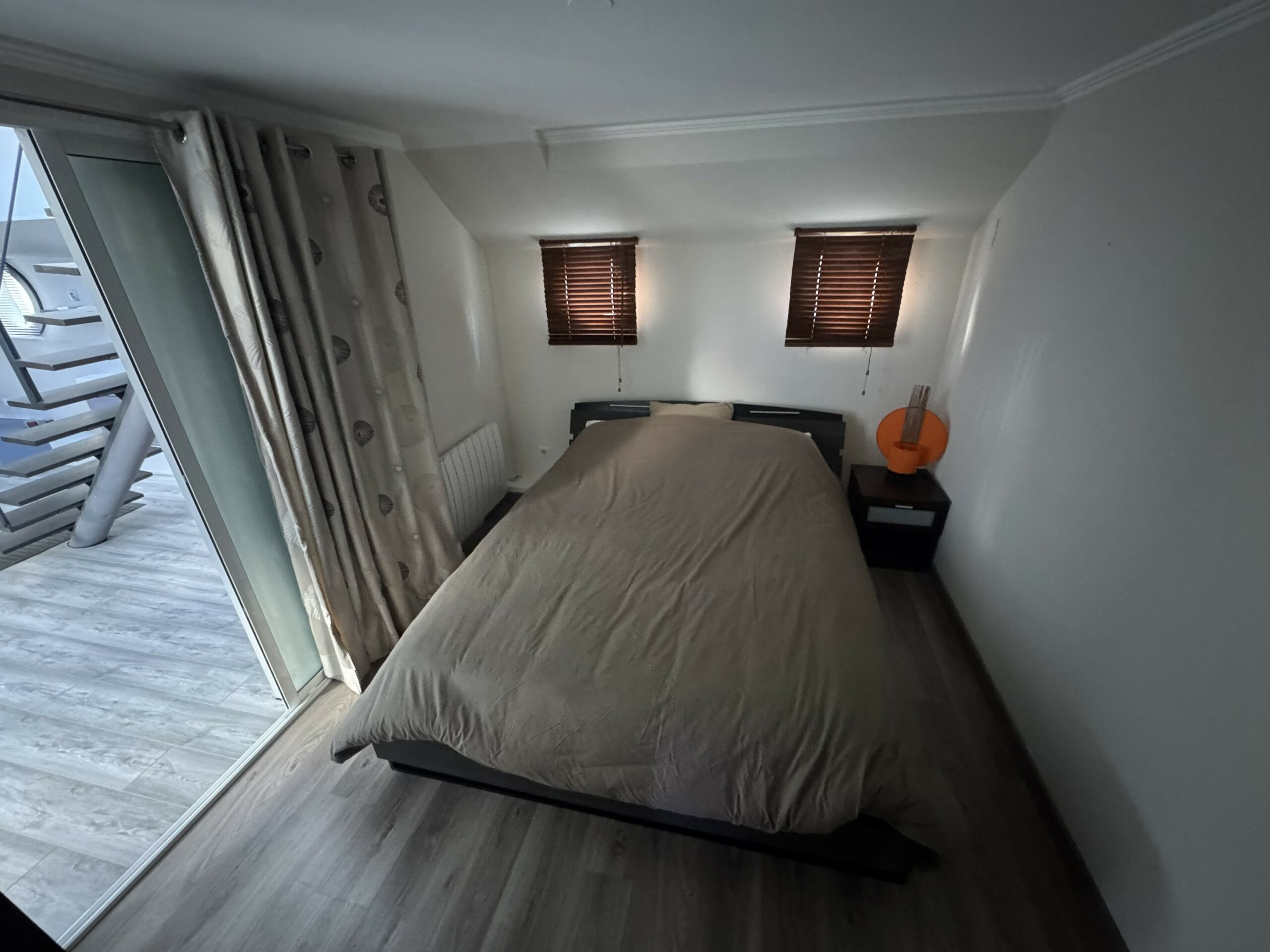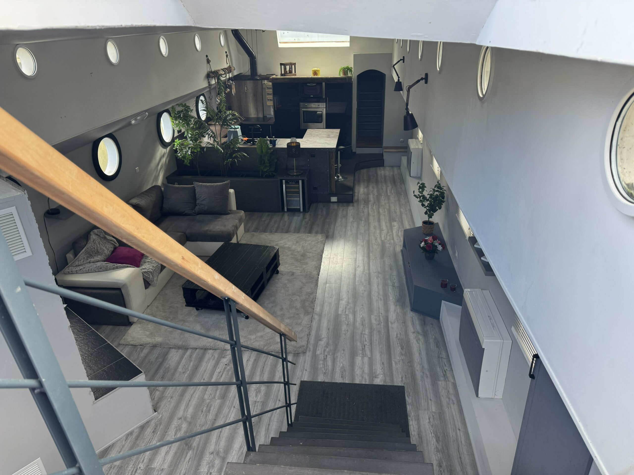 The heart of the boat is a huge, light-filled living room with high ceilings, opening onto a contemporary kitchen, ideal for entertaining and sharing. A fireplace, complemented by a heat pump, ensures optimal comfort throughout the year.