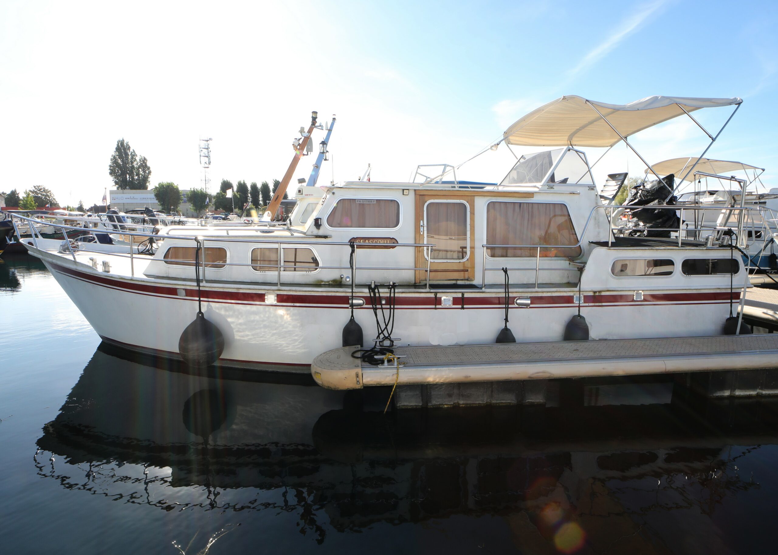Former restaurant boat converted into a liveaboard in 2018. European certificate valid until 2028. This boat offers a spacious and atypical main residence. The installation of cameras provides the pilot with support during navigation and also constant surveillance. On the upper deck, you’ll be seduced by the immense terrace and its incredible panoramic view of the water and countryside. As for the interior, it comprises the steering area, a very bright open-plan living area with galley, lounge and dinette. Two corridors each provide access to a double cabin. At the stern is a bathroom, a WC and access to the deck leading to the terrace.