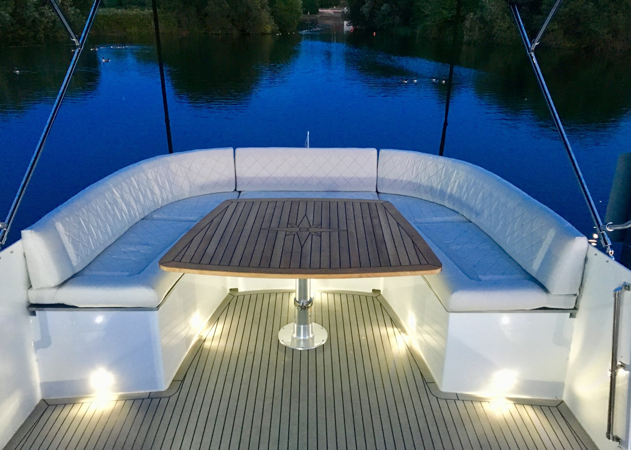 Outside, the panoramic aft deck serves as a true living space. Fitted with a bench seat featuring Sunbrella cushions and a teak table, it transforms into a full-width sun deck, sheltered by a full-length bimini. The whole area is enhanced by Flexiteak 2G decking, which is both attractive and easy to maintain.