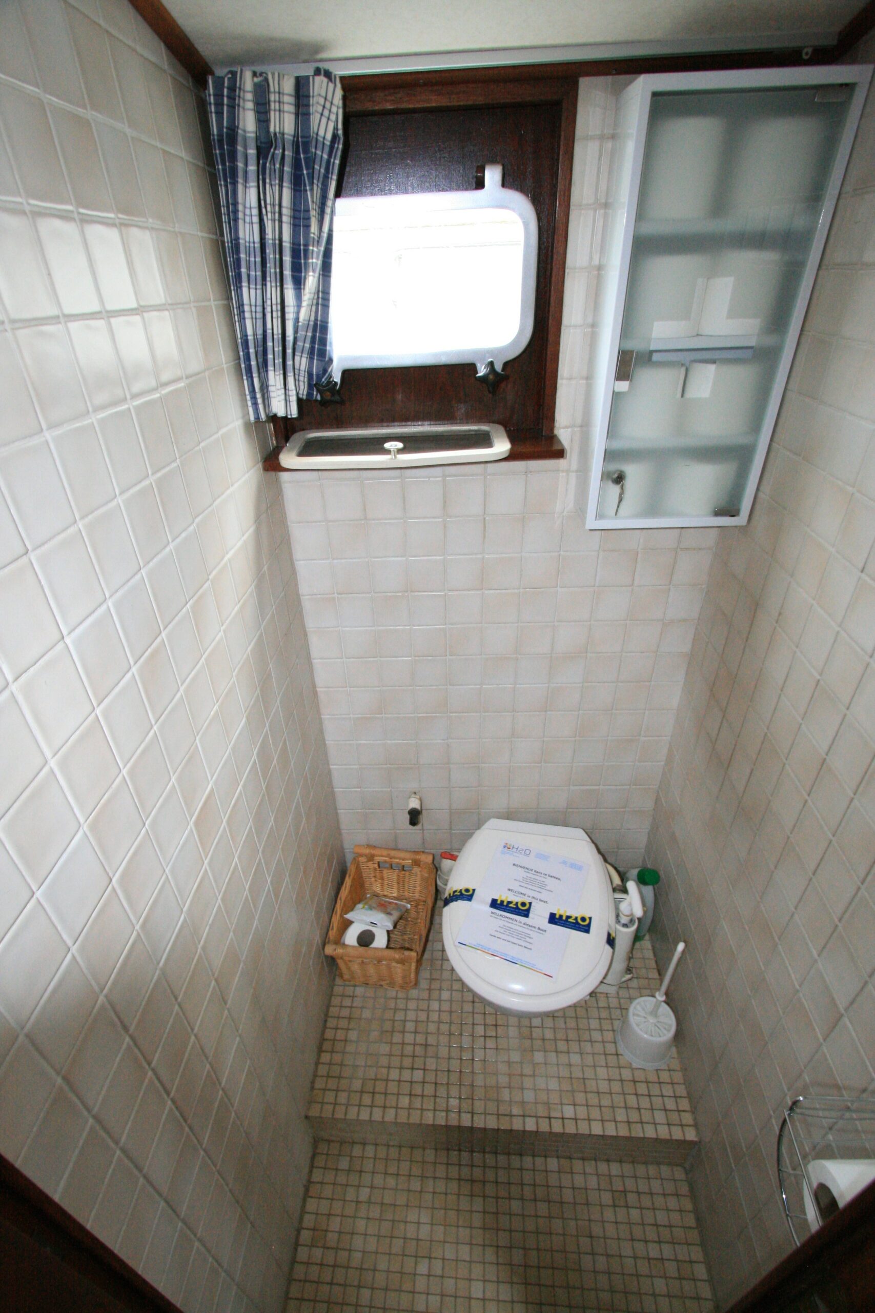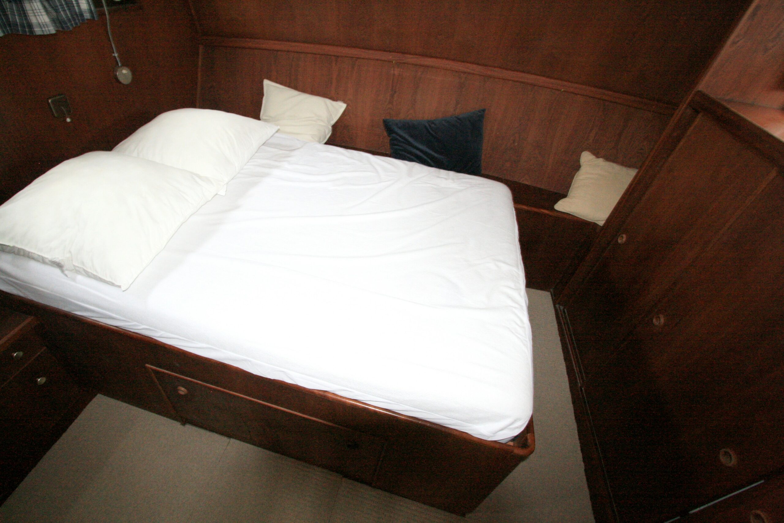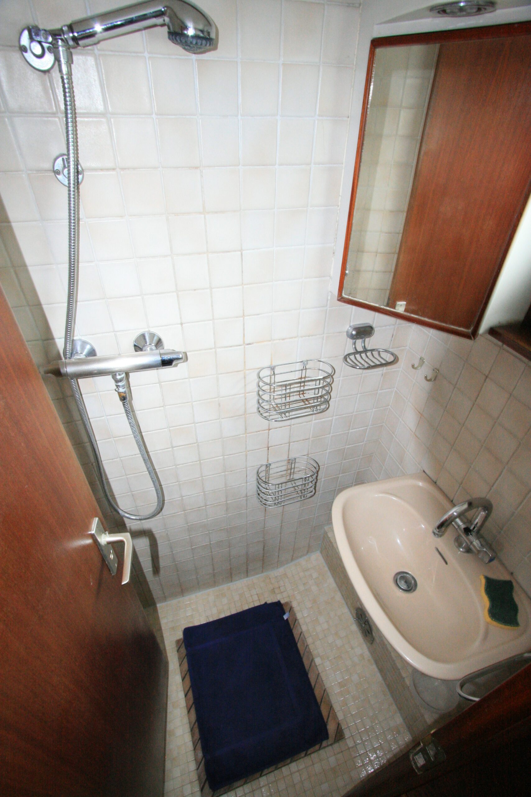 The exterior features a terrace with a steering position and a convenient side entrance. At the rear, the main cabin has a double bed and plenty of storage space, with a separate WC. The separate bathroom has a shower and washbasin, ensuring optimal comfort on board.