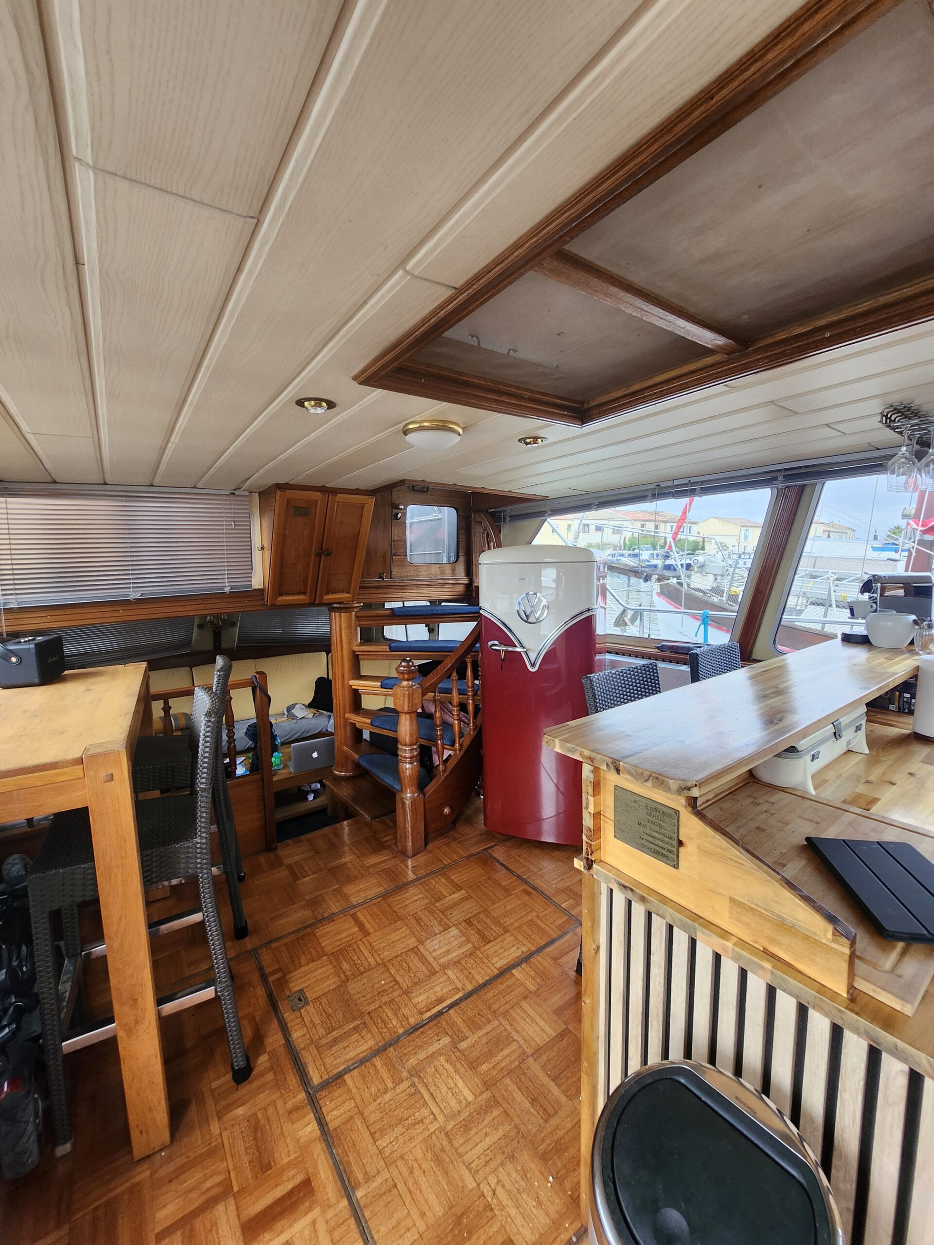 The interior surprises with its particularly spacious, bright and warm feel. The spacious and convivial saloon is a comfortable place to gather, while the functional galley blends perfectly into this living space, offering genuine living conditions on board. The layout has been designed to optimise space and make everyday life easier, reinforcing the pleasant feeling of a floating home.