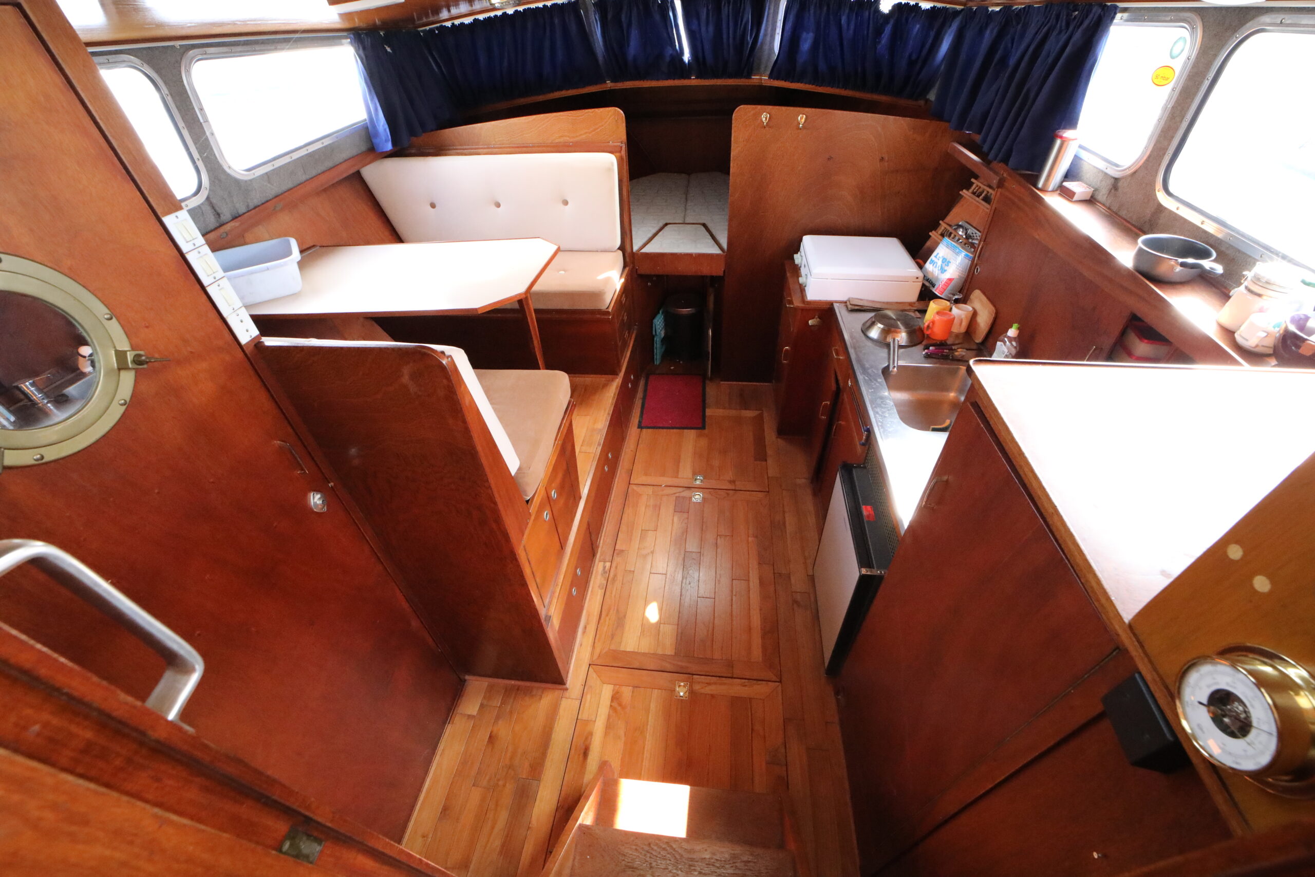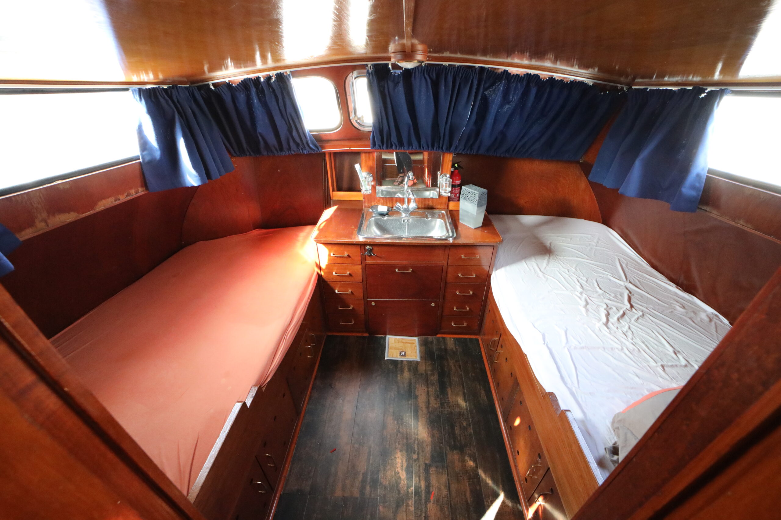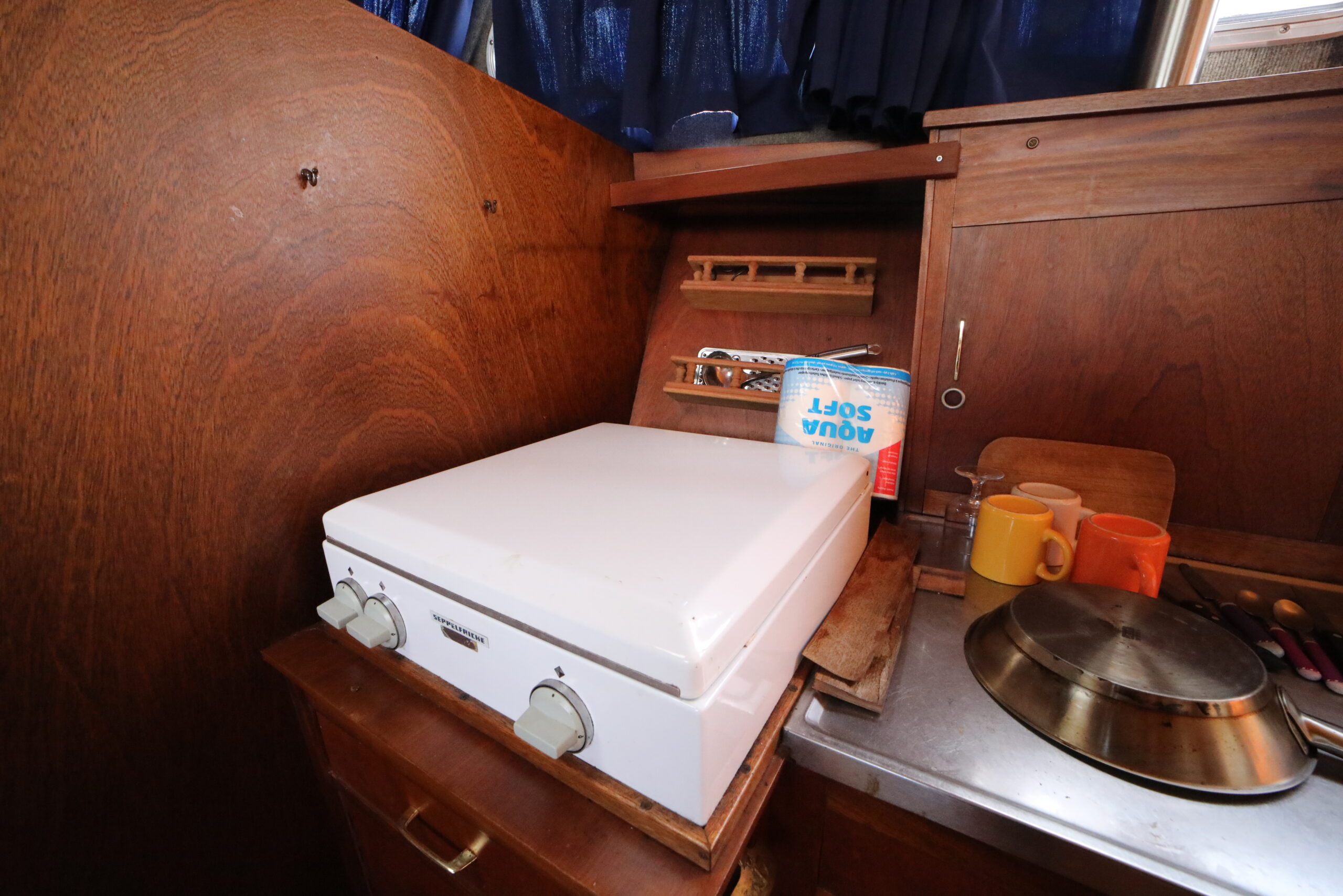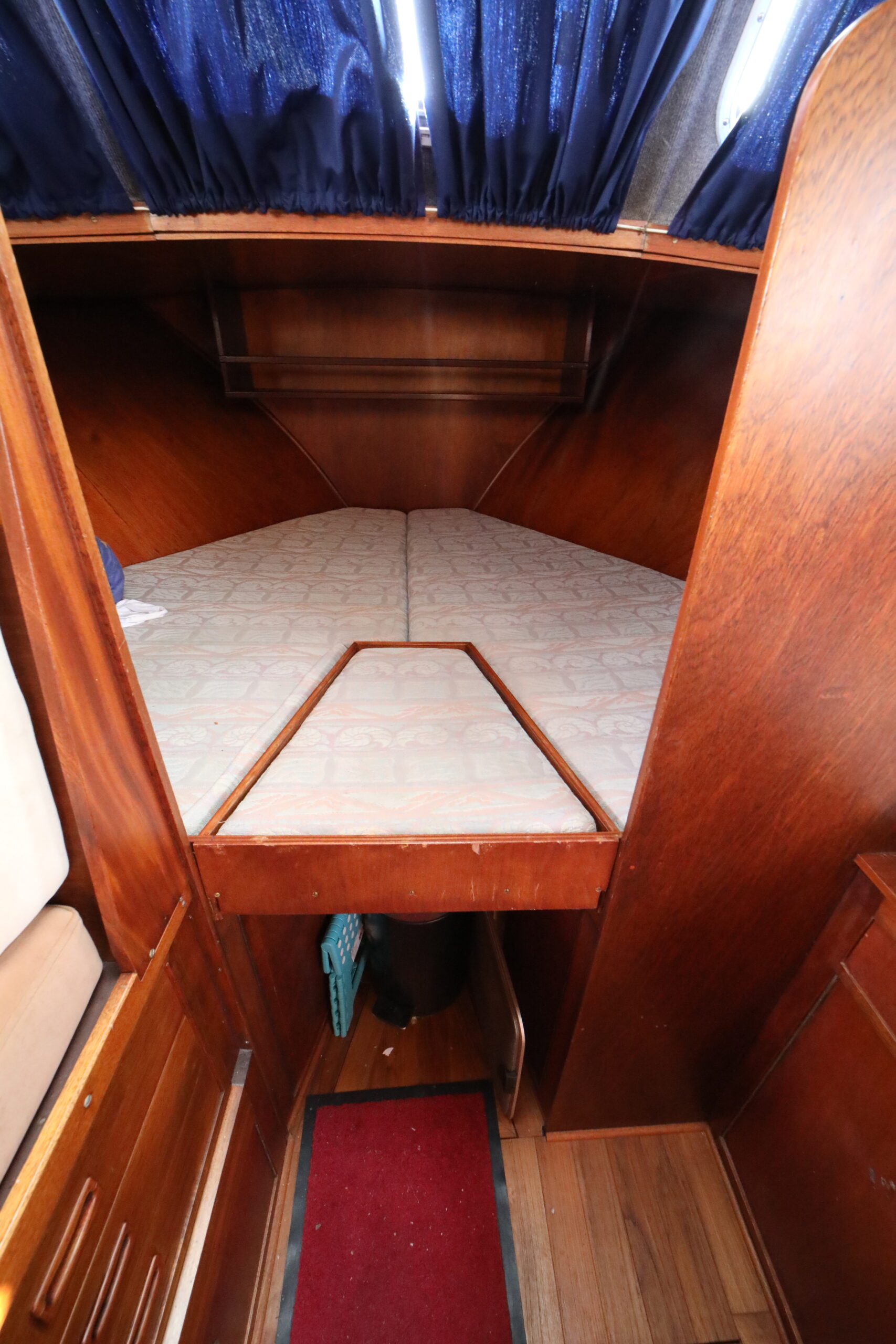 The dinette converts into a double bed and is adjacent to the functional galley. At the front, an open cabin offers an additional double bed.