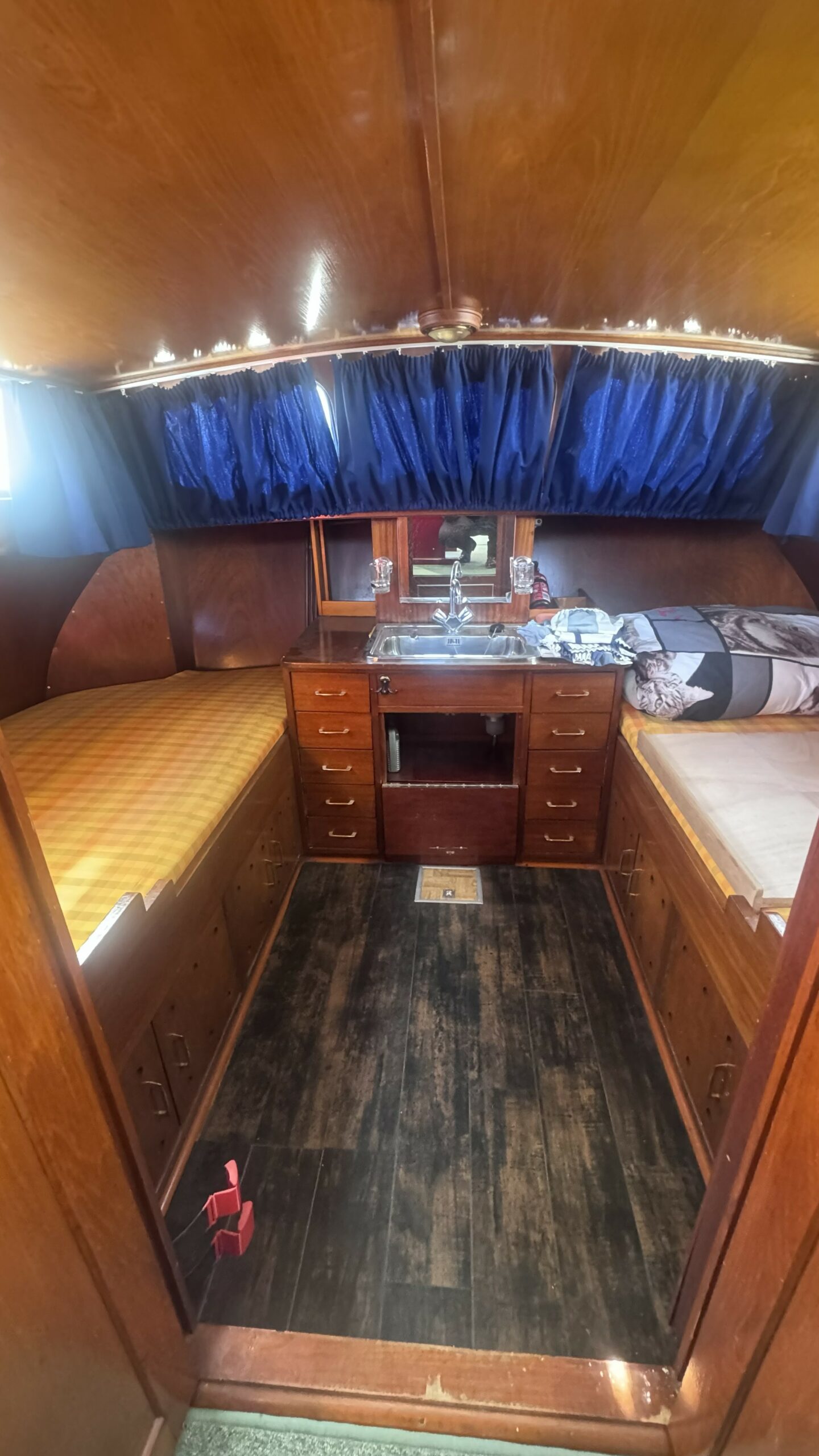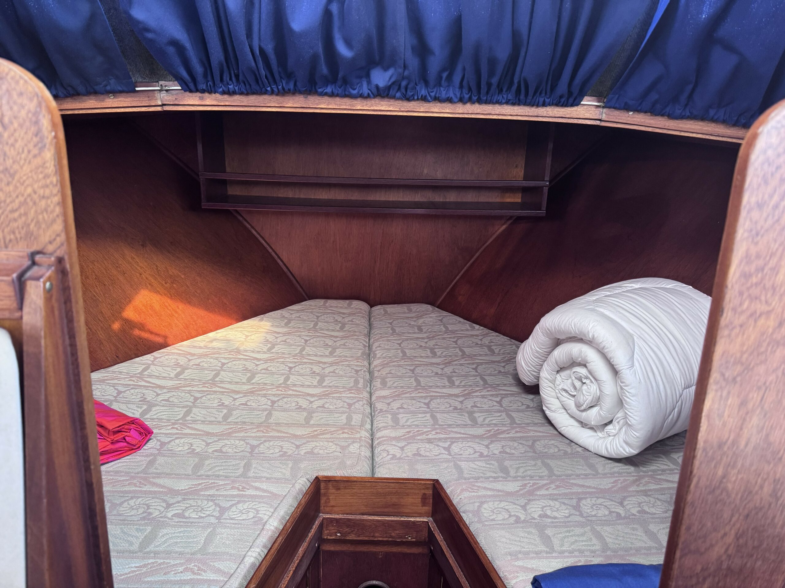 The dinette converts into a double berth and is located next to the functional galley. At the bow, an open cabin provides an additional double bed.