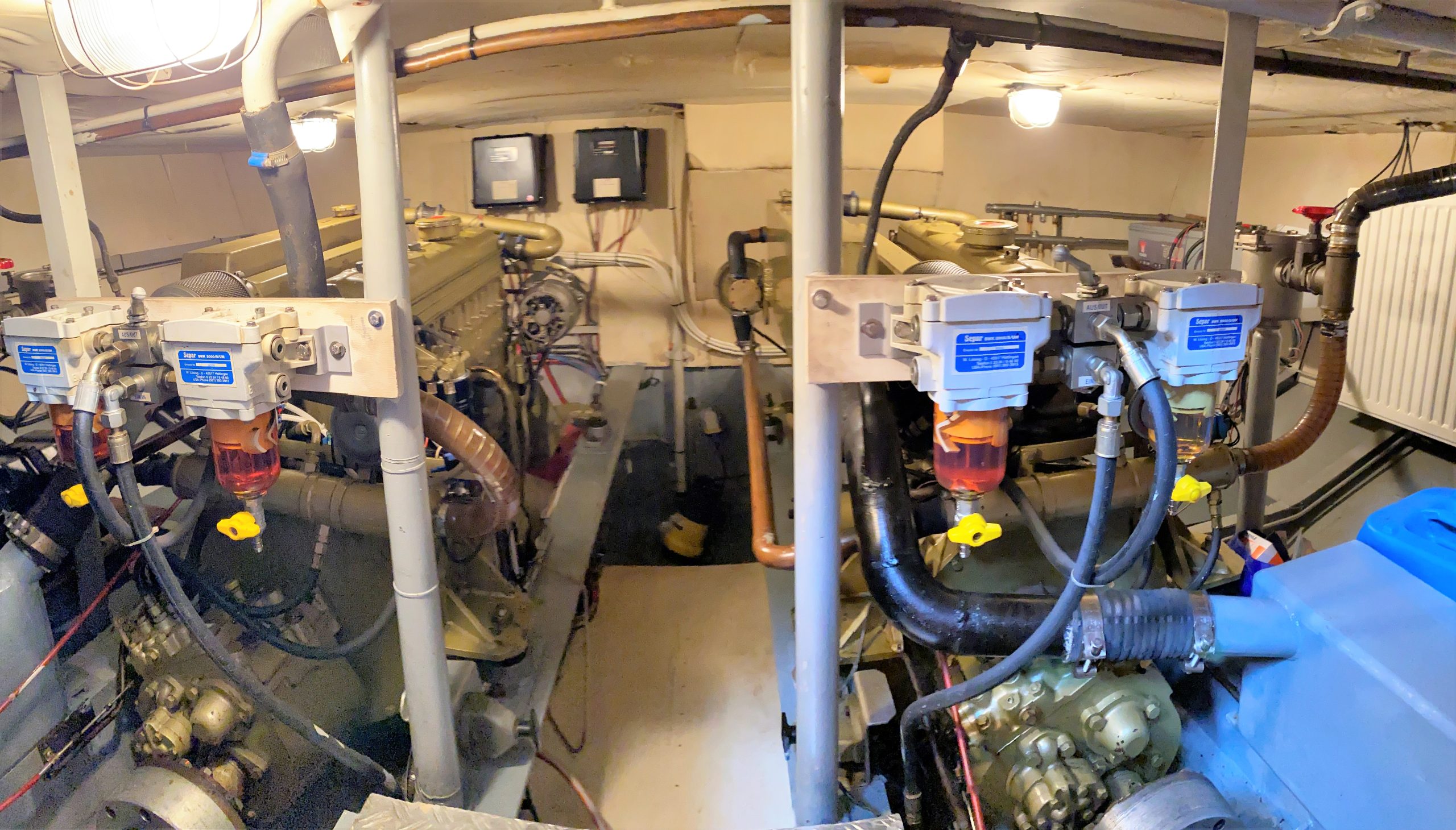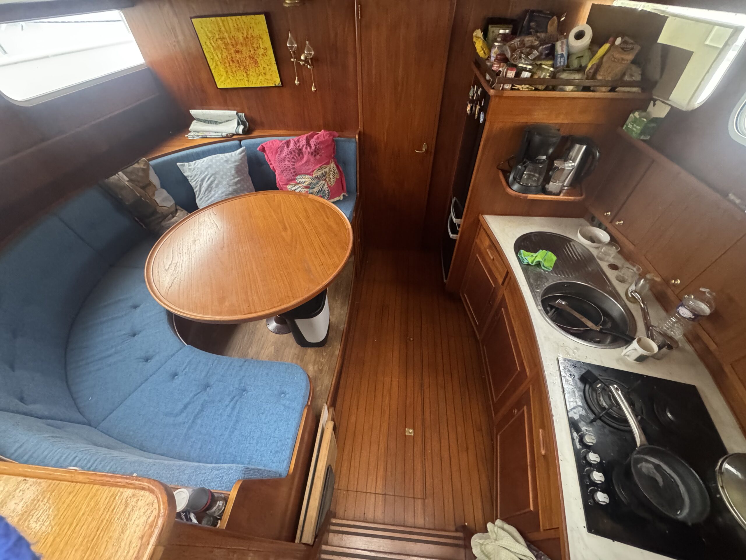 The interior stands out for its remarkable volume and exceptional comfort. The bright and welcoming saloon opens onto a fully equipped galley, featuring a gas hob, a 220 V oven, a 220 V grill, as well as a 220 V refrigerator and freezer, allowing you to prepare meals just like at home. Please note that there are some signs of condensation under a few window frames, along with a few rust spots.