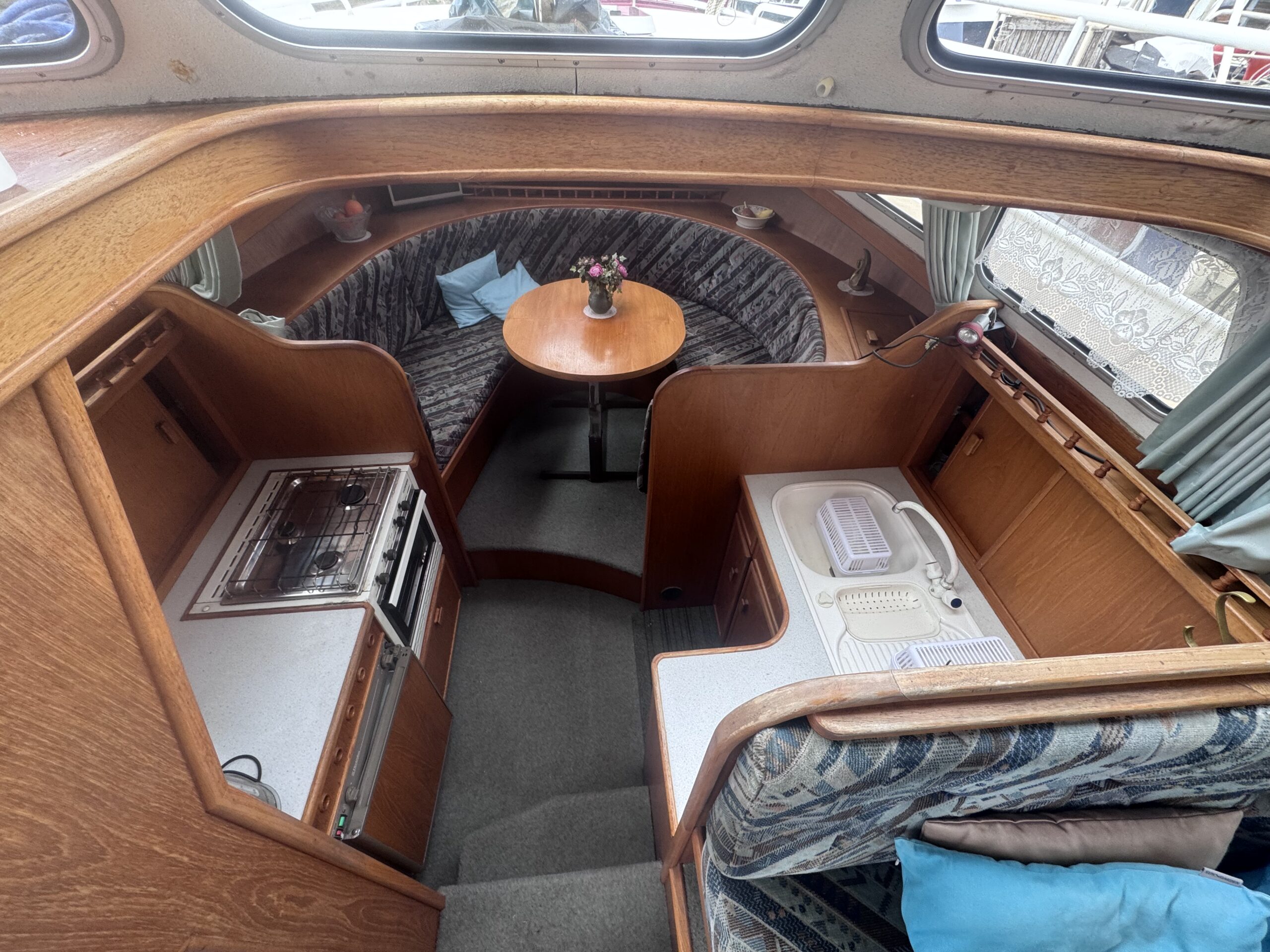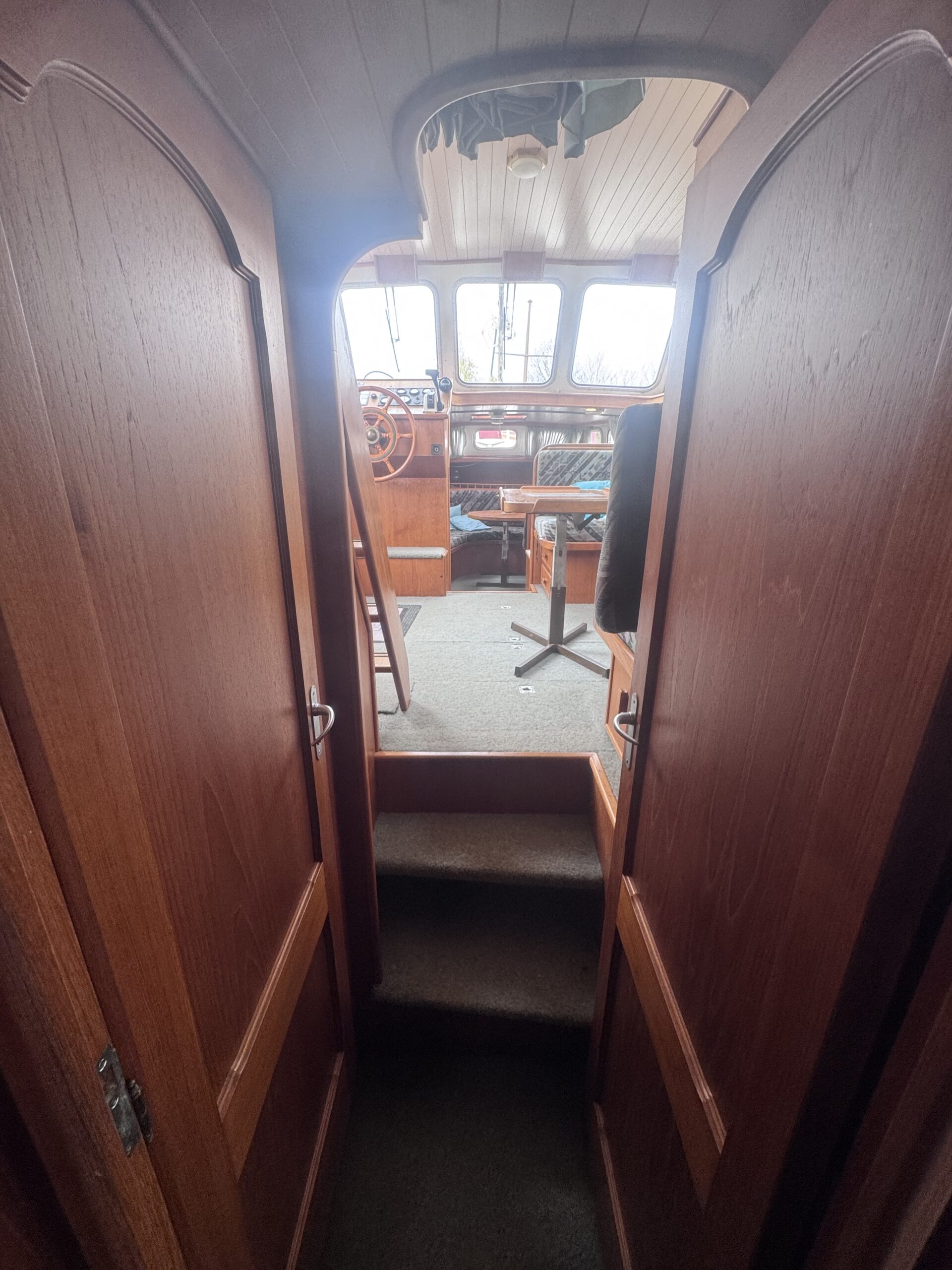 For the night area, the cruiser offers a spacious aft cabin with a double bed — a true advantage for a boat of this size. The overall layout ensures optimal comfort for getaways for two.