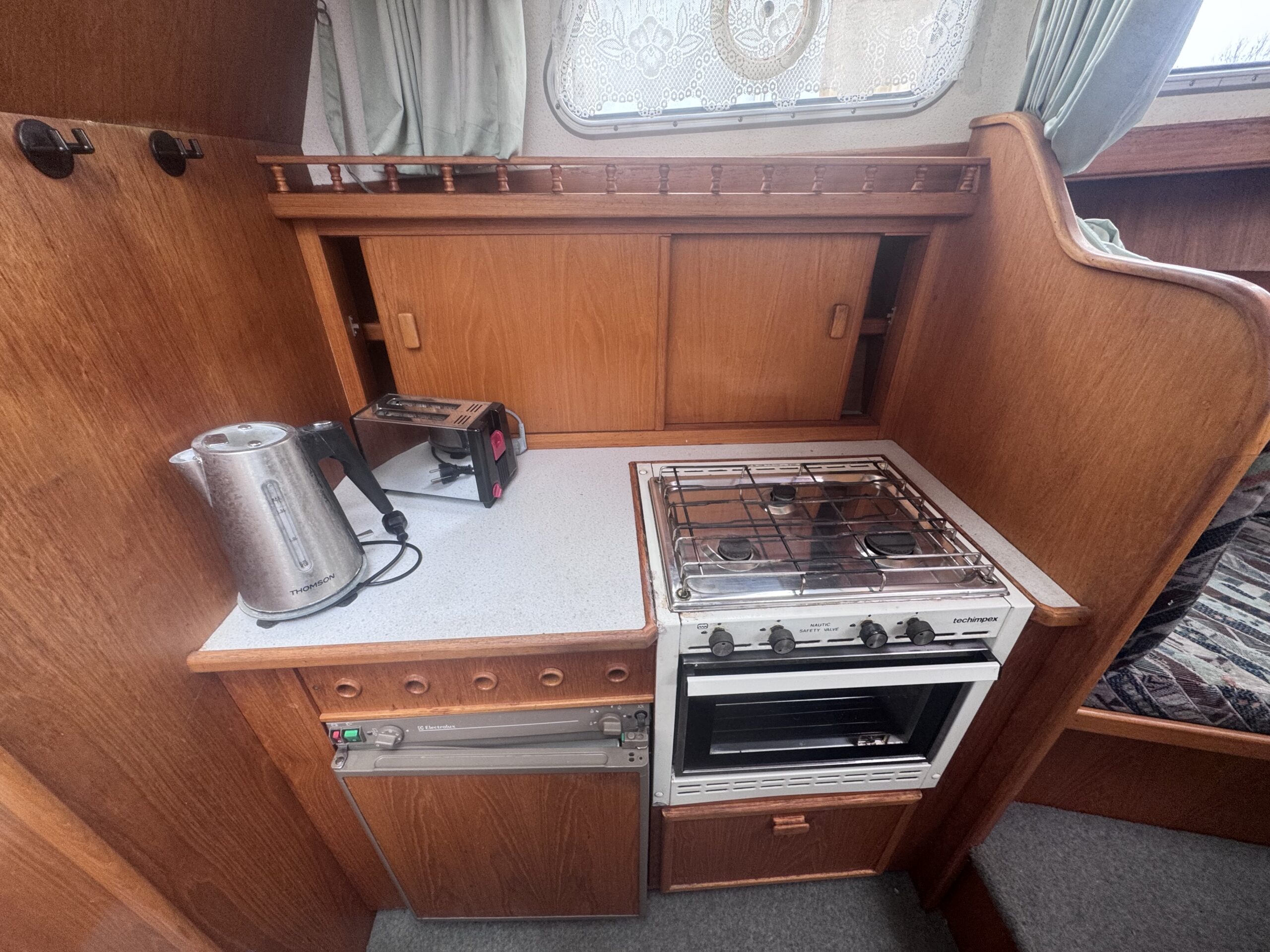 On board, you will appreciate the bright saloon equipped with a helm station, a sofa, and a functional galley featuring a gas hob, gas oven, and gas refrigerator. In addition, the bathroom includes a shower and a toilet, providing everything needed for pleasant stays on the water.