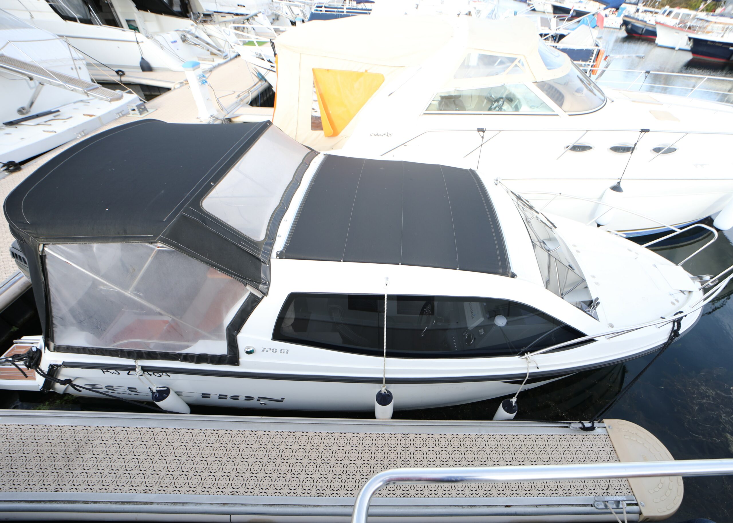 Despite its moderate size, the 720 GT offers the same level of equipment as a full-sized cruiser, while providing added versatility. The photos shown here show the boat in its covered and uncovered versions.