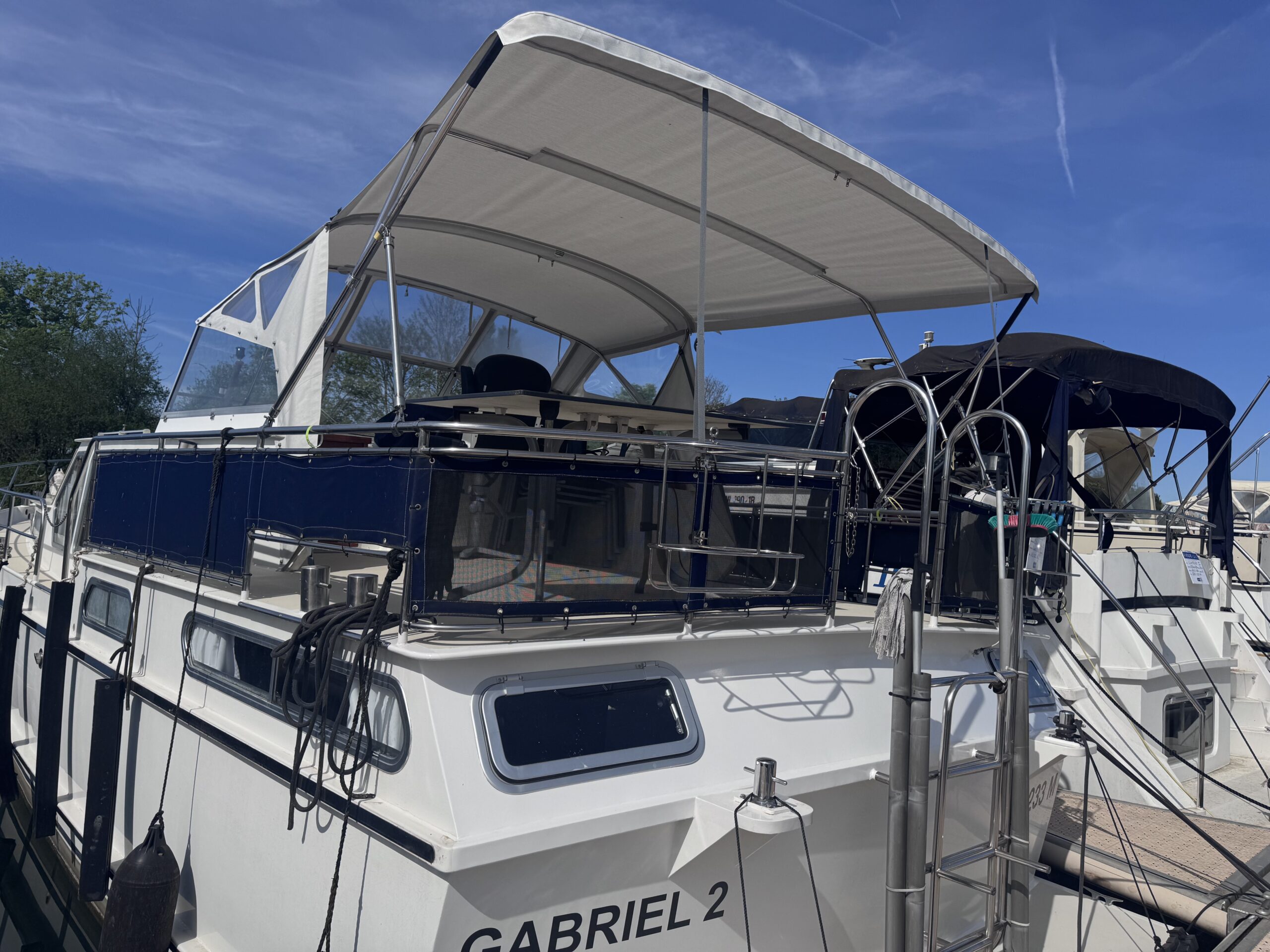 Inside, you’ll find a bright saloon with ample headroom, a comfortable seating area, and large windows that bring in plenty of warmth and natural light. The fully equipped galley (gas hob, gas fridge, and 12V fridge) is perfectly suited to life on board. The layout includes an aft cabin with a double bed and private bathroom, a forward cabin with multiple berths, and a convertible dinette. Altogether, the boat can comfortably accommodate up to 6 people—perfect for welcoming family and friends.